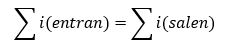 Ahora bien. Cabe mencionar que hay corrientes que entran a un nodo. Pero también puede ocurrir que haya corrientes que salen del nodo. Esas corrientes que entran pueden ser consideradas positivas y las que salen pueden considerarse negativas. Si por ejemplo en un nodo entran unas corrientes, deben haber unas que salgan. Está representada mediante la siguiente ecuación.