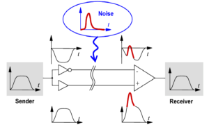 Cuando enviamos datos a través de una línea y el retorno se realiza por la línea adyacente, estamos en modo diferencial. Si el acoplamiento es perfecto, la fuente de ruido se cancela y las señales, al pasar por el elemento pasivo, se desfasarán 180 grados una respecto a la otra, lo que hará que la suma vectorial sea nula y el acoplamiento sea óptimo.