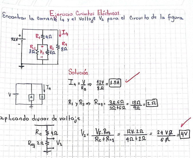 En este ejercicio resolvemos un circuito eléctrico en corriente continua con el objetivo de encontrar la corriente I4I_4 y el voltaje V2V_2 aplicando conceptos básicos de ley de Ohm, resistencias en paralelo y divisor de voltaje.