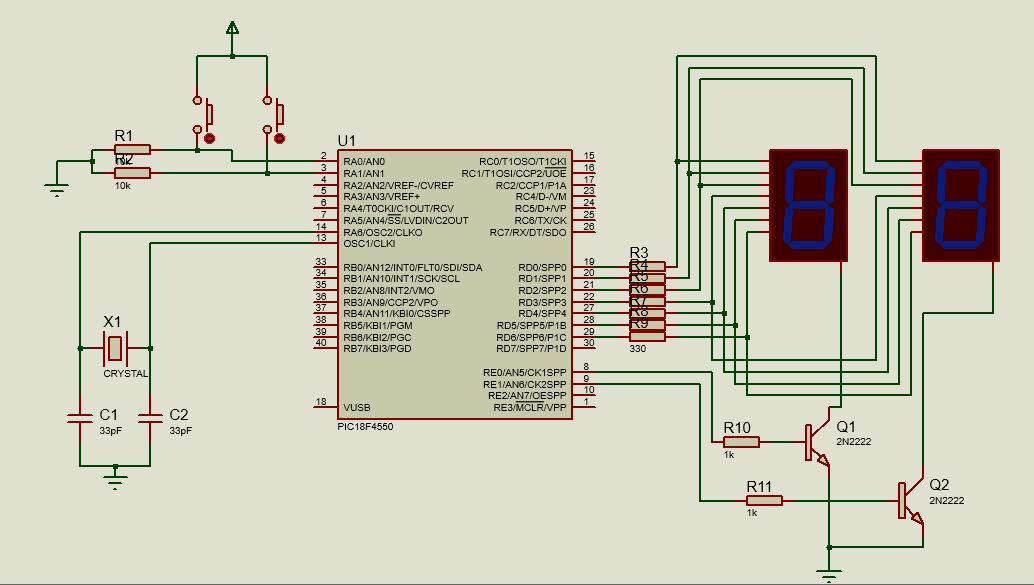 En este proyecto se implementa un contador digital de 00 a 99 utilizando el microcontrolador PIC18F4550, dos displays de 7 segmentos y dos pulsadores. El sistema permite incrementar y decrementar el valor mostrado mediante los pines RA0 y RA1, respectivamente. Además, se emplea multiplexación para controlar ambos displays con un número reducido de pines.