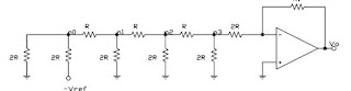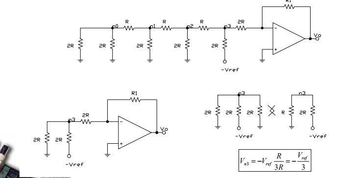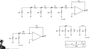 para este circuito podemos observar un par de resistencias conectadas en escalera en forma serie/paralelo como si fueran divisores de tensión y finalmente llegan las conexiones a un amplificador inversor.