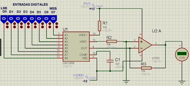 el DAC 0808 es un convertidor de digital a analógico monolítico de 8 bits con un tiempo de ajuste de escala completa de 150 nanosegundos (nS) mientras que solo disipa 33mW de potencia con suministros de tensión de +5Volts. No requiere ningún recorte de corriente de referencia Iref para la mayoría de aplicaciones ya que la corriente de salida de escala completa es típicamente ± 1 LSB de 255 I REF / 256. Las precisiones relativas de mejor que ± 0,19% aseguran la monotonicidad y la linealidad de 8 bits, mientras que la corriente de salida de nivel cero de menos de 4 μA proporciona precisión cero de 8 bits para I REF > = 2 mA. Las corrientes de suministro de energía del DAC0808 son independientes de los códigos de bit, y exhiben características de dispositivo esencialmente constantes en todo el rango de voltaje de suministro.