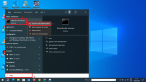 1. Ingresar al icono de windows, ingresar a donde dice «símbolo del sistema» dar clic derecho y buscar la opción «ejecutar como administrador» sino te aparece, debes ingresar a la lupa de búsqueda de windows y escribir «CMD» luego clic derecho y dar «ejecutar como administrador» siga la secuencia de pasos descrita en la figura 1.