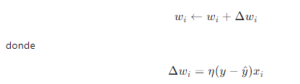 - Los pesos se ajustan utilizando una regla de aprendizaje basada en el error cometido por el perceptrón en la clasificación de los datos de entrenamiento. Un algoritmo comúnmente utilizado es el algoritmo de aprendizaje del perceptrón, que actualiza los pesos de la siguiente manera: