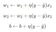 Aquí, es la tasa de aprendizaje, es la etiqueta real, y ^ es la salida predicha por el perceptrón.