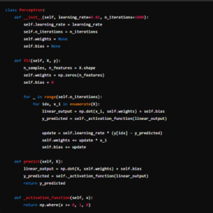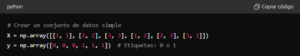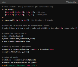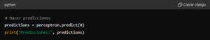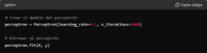 Este ejemplo ilustra los conceptos básicos de un perceptrón simple: inicialización de pesos y sesgo, cálculo del producto punto, aplicación de la función de activación y actualización de los pesos en función del error.