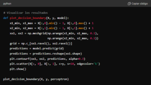Este código crea una visualización del límite de decisión aprendido por el perceptrón. Los puntos serán coloreados según sus etiquetas y el fondo mostrará la región donde el perceptrón clasifica los puntos como 0 o 1.