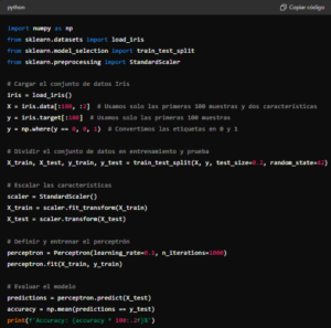 Aquí tienes un ejemplo de cómo implementar y entrenar un perceptrón simple en Python utilizando la biblioteca numpy